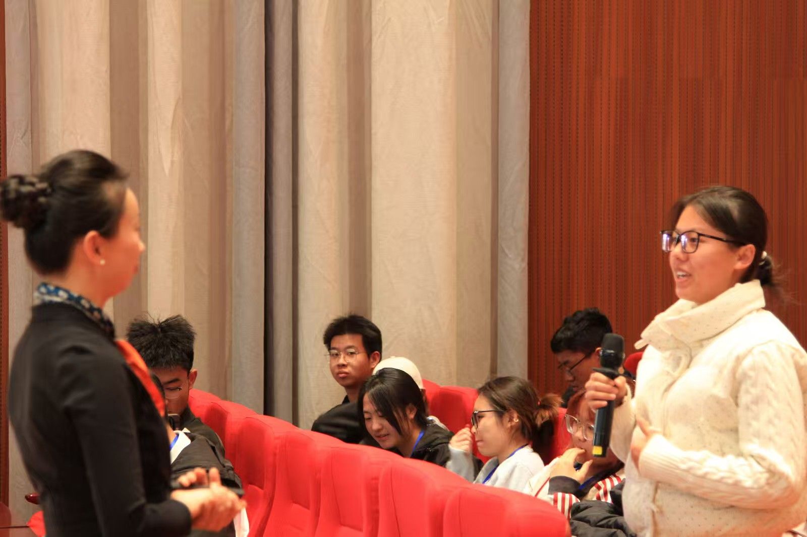 杨春静以“大学生礼仪的意义与内涵”为切入点,从形象礼仪、社交礼仪、沟通礼仪几个维度展开讲述,并结合生动案例,通过现场互动和情景模拟等,详细讲解了仪容仪表、站姿坐姿、手势引导、语言规范等细节要点。培训内容丰富,现场氛围热烈。