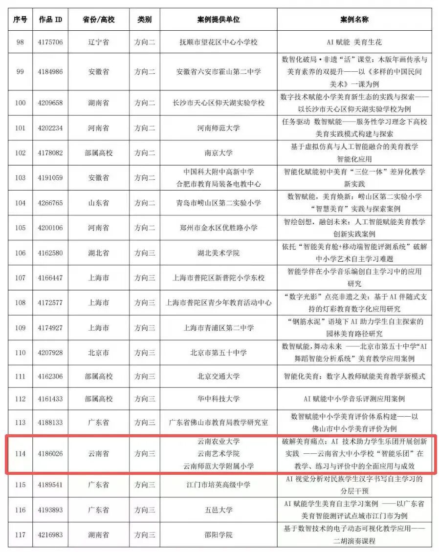 近日,教育部教育技术与资源发展中心(中央电化教育馆)正式公布 2025 年度数字化美育资源和智能化美育应用案例征集工作结果,由云南农业大学申报的《破解美育痛点:AI 技术助力学生乐团开展创新实践 —— 云南省大中小学校 “智能乐团” 在教学、练习与评价中的全面应用与成效》成功入选智能化美育应用案例名单。
